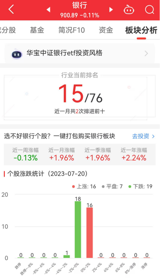 中国经济网北京7月20日讯今日,银行板块整体跌幅0.11%,其中16只股票上涨,7只股票平盘,19只股票下跌。