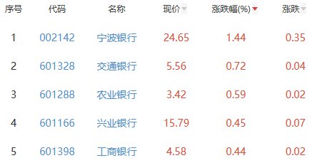 其中,宁波银行、交通银行、农业银行、兴业银行、工商银行位列板块涨幅前五位,涨幅分别为1.44%、0.72%、0.59%、0.45%、0.44%。