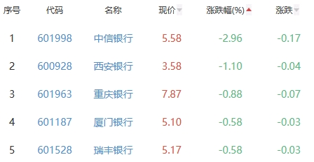 中信银行、西安银行、重庆银行、厦门银行、瑞丰银行位列涨幅榜后五位,涨幅分别为-2.96%、-1.10%、-0.88%、-0.58%、-0.58%。