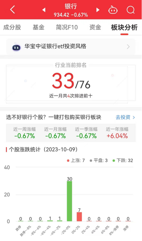 中国经济网北京10月9日讯今日,银行板块整体涨幅-0.67%,其中7只股票上涨,3只股票平盘,32只股票下跌。