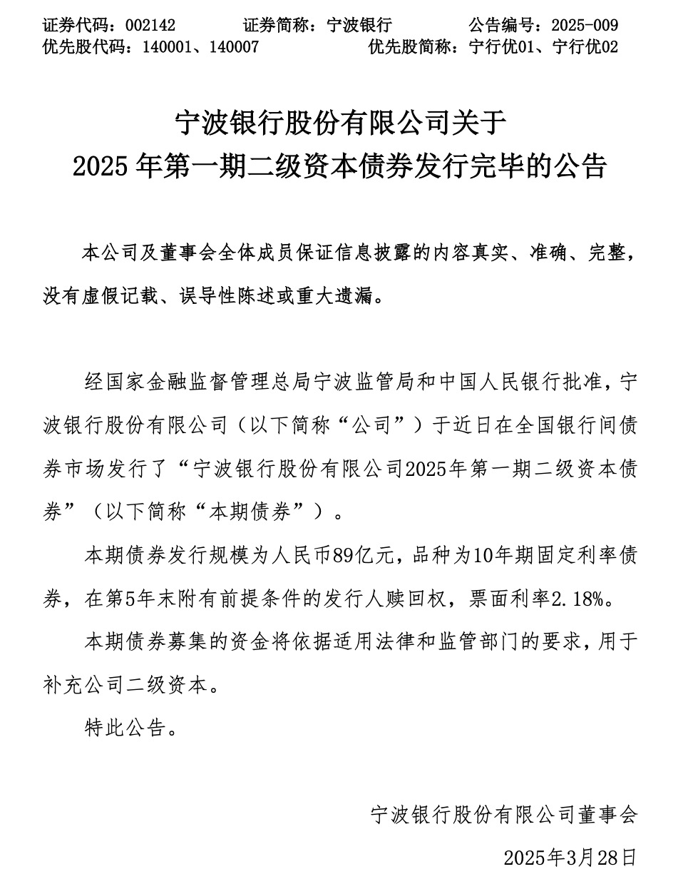 3月27日,宁波银行发布公告称,经国家金融监督管理总局宁波监管局和中国人民银行批准,宁波银行股份有限公司于近日在全国银行间债券市场发行了“宁波银行股份有限公司2025年第一期二级资本债券”。
