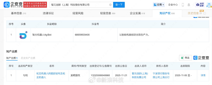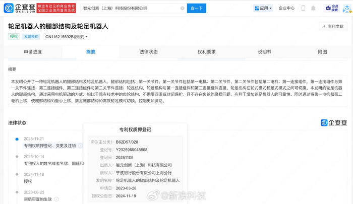 智元机器人出质轮足机器人专利予宁波银行上海分行