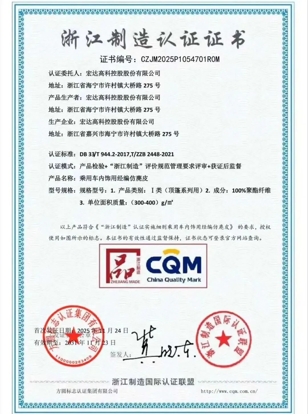 近日,宏达高科自主研发的“乘用车内饰用经编仿麂皮”产品顺利通过“浙江制造”认证,荣获《浙江制造认证证书》(证书编号:CZJM2025P1054701ROM)。该认证依据DB 33/T 944.2-2017、T/ZZB 2448-2021标准严格审核,标志着我司产品在品质稳定性、技术创新性及环保安全性等方面均达到“浙江制造”高标准要求。
