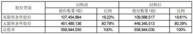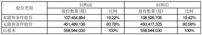 2、在回购股份价格不超过人民币9.33元/股的条件下,按回购金额下限1000万元测算,预计回购股份数量约为1,071,811股,约占公司目前已发行总股本的0.19%。假设本次回购股份全部用于员工股权激励或员工持股计划,则预计回购股份转让后的公司股权变动情况如下: