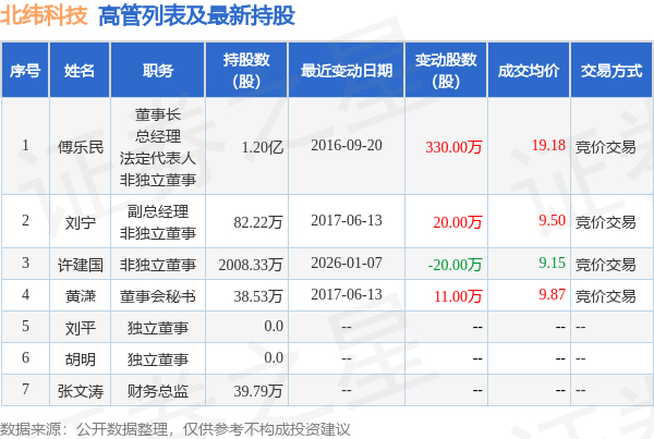 北纬科技的高管列表及最新持股情况如下: