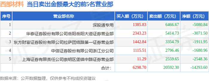 证券之星消息,沪深交易所2026年1月13日公布的交易公开信息显示,西部材料(002149)因日跌幅偏离值达到7%的前5只证券登上龙虎榜。此次是近5个交易日内第2次上榜。