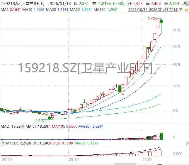 1月13日,卫星板块巨幅震荡。数据显示,截至11时19分,两融标的卫星产业ETF(159218)放量涨0.17%,盘中振幅达10.99%,一度跌9.73%。成分股北斗星通、北方导航、航天电器、光库科技、派克新材、航天环宇跌幅居前。交投持续升温,换手率达45.95%,成交额超18.7亿再刷新高。资金热度不减,据Wind Level2实时行情结合均价预估,盘中净流入约6.3亿,截至发稿,该基金获资金连续8日净流入,累计超25.3亿,年初以来累计净流入约25.3亿,以实时成交价估算,盘中预估规模超50亿。