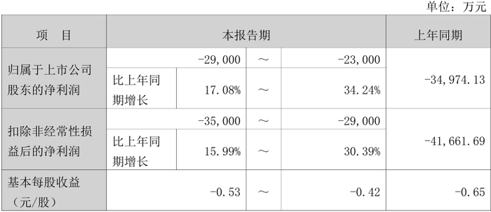 1月22日,北斗星通(002151)发布公告,预计2025年度约亏损2.9亿元至2.3亿元,较上年同期亏损3.5亿元增长17.08%至34.24%。具体数据如下: