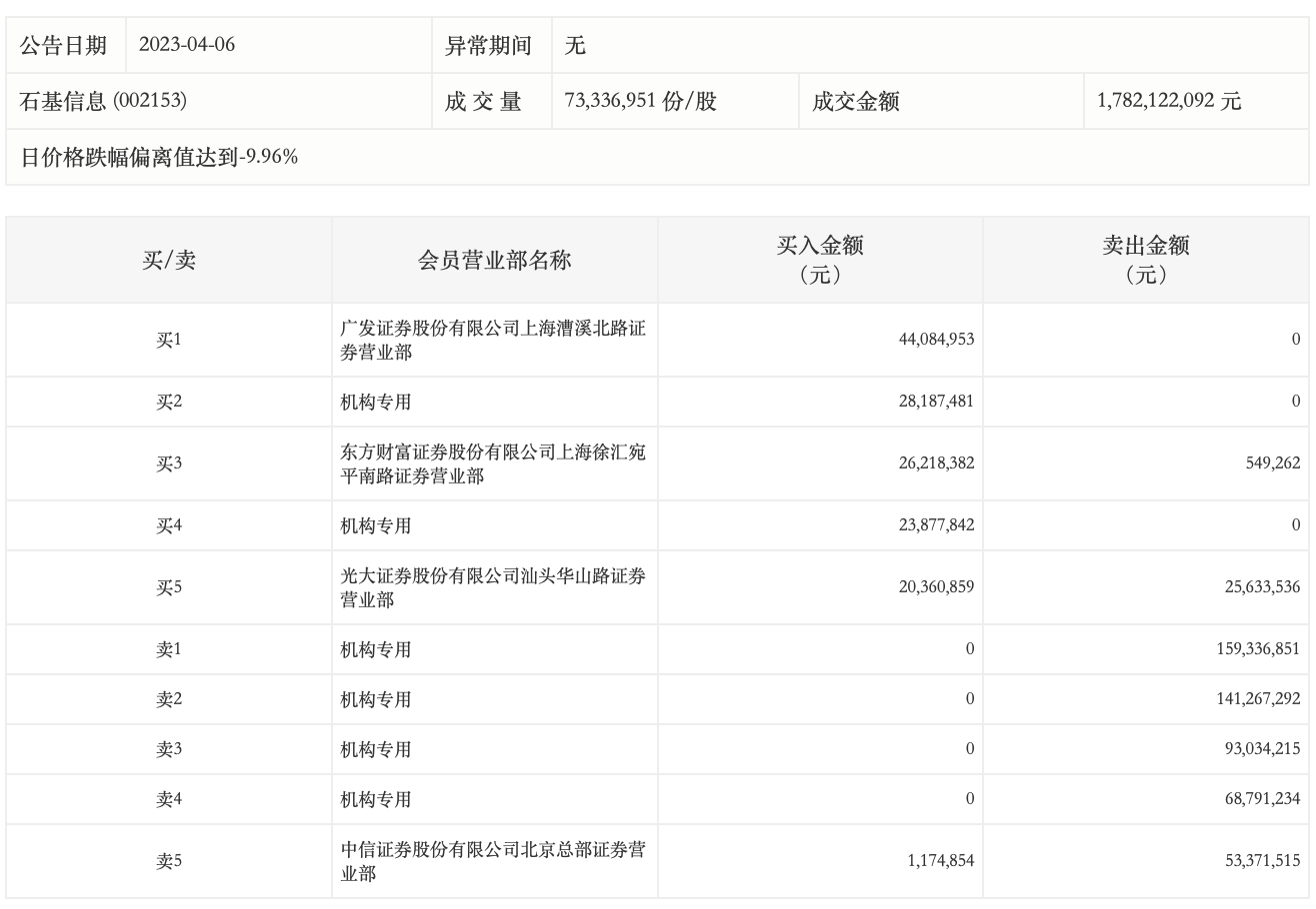 4月6日,石基信息今日跌停,龙虎榜数据显示,上榜营业部席位全天成交6.86亿元,占当日总成交金额比例为38.49%。其中,买入金额为1.44亿元,卖出金额为5.42亿元,合计净卖出3.98亿元。