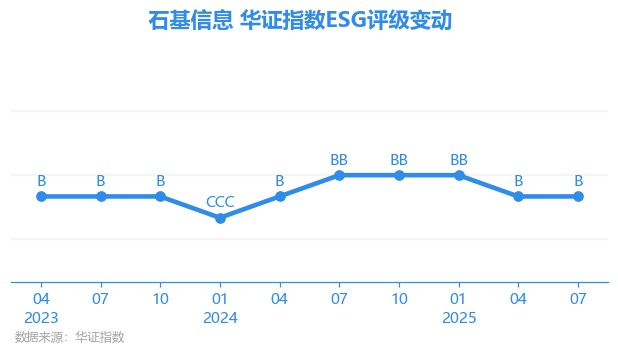 日前,华证指数公布了新一期(2025年7月31日)的ESG评级结果,石基信息(002153.SZ)获得B评级(华证指数评级为C起至AAA九档,C为最低档,AAA为其最高一级评级/AA为其第二档),上一期(2025年4月30日)ESG评级为B。本期ESG评级在156家软件行业A股上市公司中排名第105(上一期排名第85)。