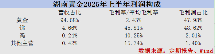 根据定期报告,2025年上半年,湖南黄金的外购非标金数量增加,使得成本增幅大于营收增幅,导致黄金产品毛利率下降1.4个百分点至2.43%,同期上述近270亿元营收所产生的毛利润仅有6.54亿元。