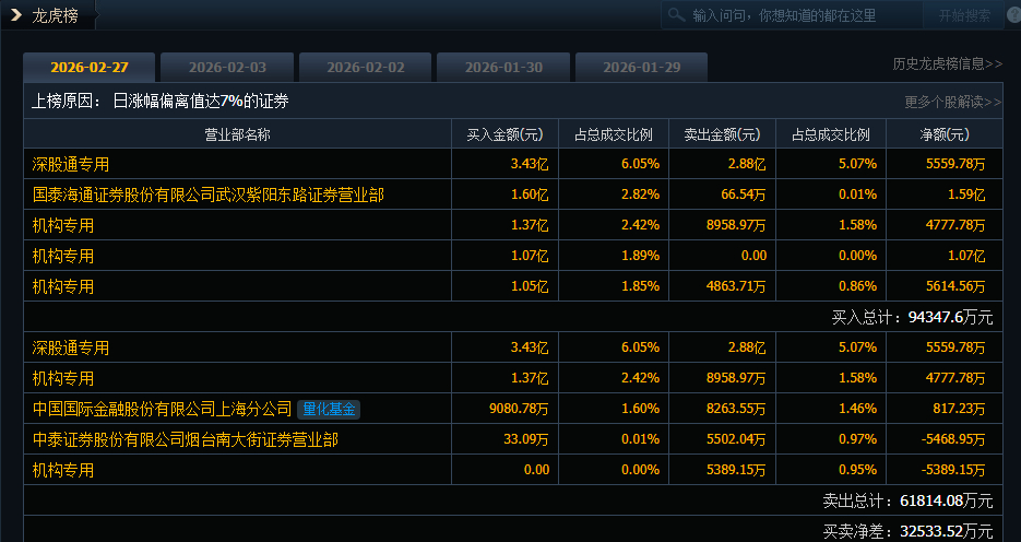 湖南黄金今日涨停,3家机构专用席位净买入2.11亿元