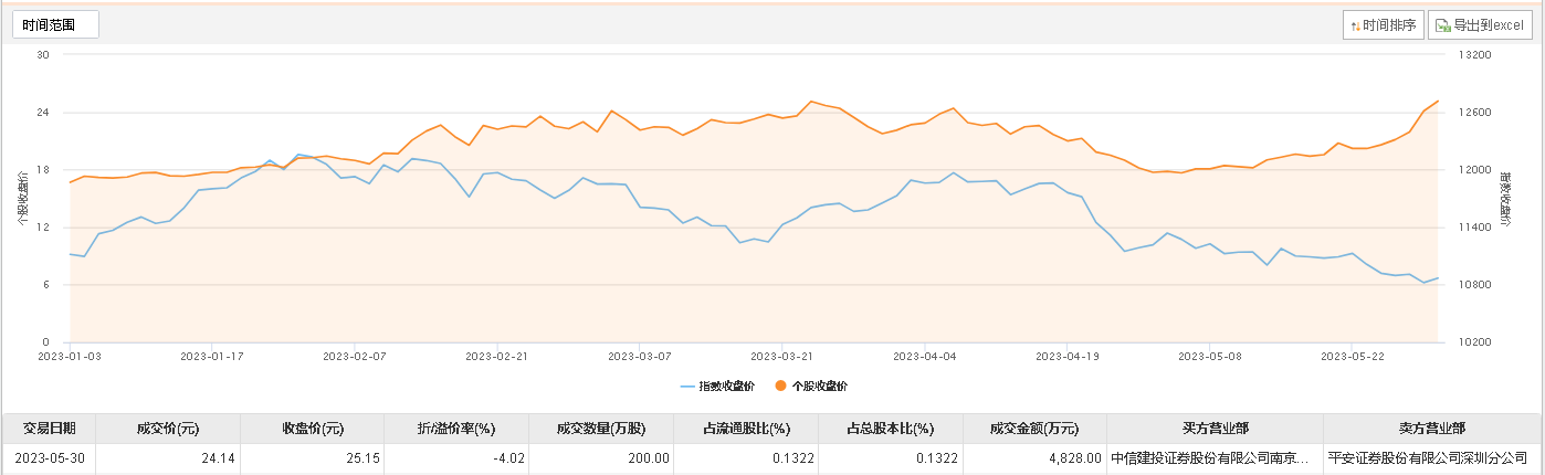 5月30日大宗交易成交200万股,成交额4828万元,占当日总成交额的1.16%,成交价24.14元,较市场收盘价25.15元折价4.02%。