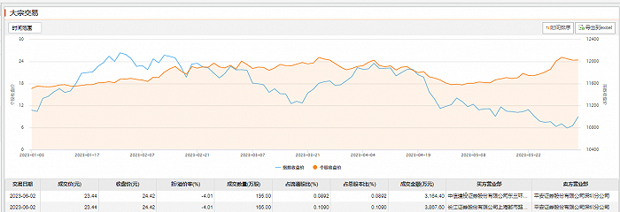 6月2日大宗交易成交300万股,成交额7032万元,占当日总成交额的4.23%,成交价23.44元,较市场收盘价24.42元折价4.01%。