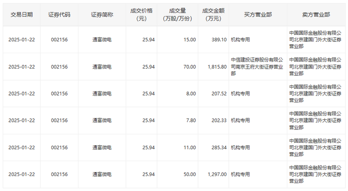 1月22日大宗交易成交161.8万股,成交额4197.09万元,占当日总成交额的2.02%,成交价25.94元,较市场收盘价28.87元折价10.15%。