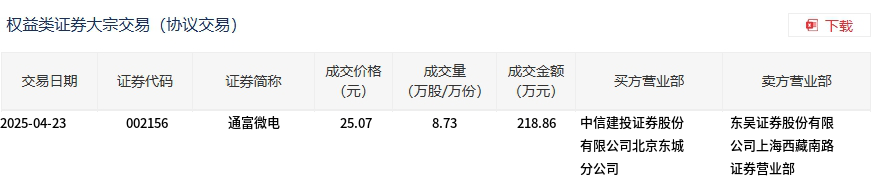 通富微电今日大宗交易折价成交8.73万股,成交额218.86万元