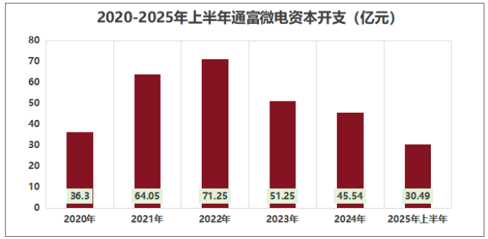 通富微电的资本开支一直处于高位,2020年-2025年上半年合计近300亿,三家头部企业(长电科技、华天科技、通威微电)中,支出金额最大的。