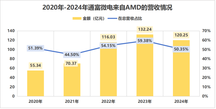 技术迭代叠加股权绑定,AMD有80%以上的封测业务都给了通富微电,通富微电也有一半营收来自AMD。2024年,AMD为通富微电贡献约120.25亿元营收,占公司总营收的比例达到50.35%。