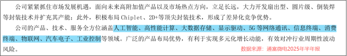 二来,通富微电封测技术持续走在前沿,为切入其他客户的供应体系打下了良好基础。2025年上半年,通富微电的客户已经覆盖了包括德州仪器、联发科在内的大多数世界前20强半导体企业和绝大多数国内知名芯片设计公司。