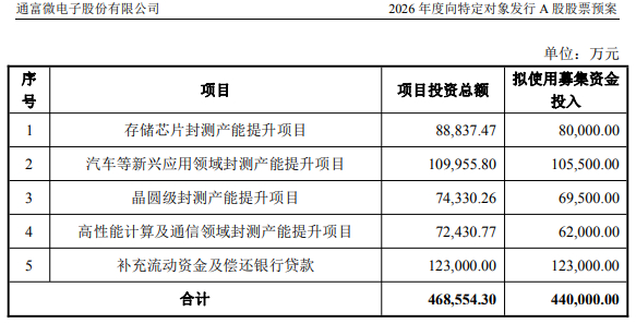 中国经济网北京1月12日讯 通富微电(002156.SZ)1月9日晚间披露的2026年度向特定对象发行A股股票预案显示,本次向特定对象发行股票募集资金总额不超过440,000.00万元(含本数),扣除发行费用后拟全部用于以下项目:存储芯片封测产能提升项目、汽车等新兴应用领域封测产能提升项目、晶圆级封测产能提升项目、高性能计算及通信领域封测产能提升项目、补充流动资金及偿还银行贷款。