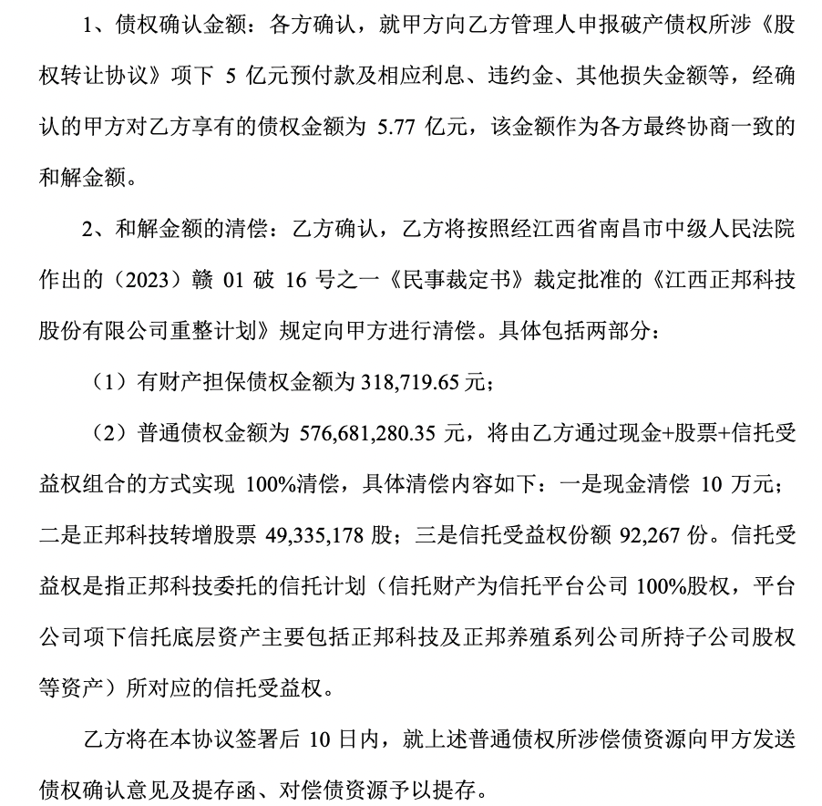 根据大北农与正邦科技以及相关方签署的《和解协议》,就甲方(大北农)向乙方(正邦科技)管理人申报破产债权所涉《股权转让协议》项下5亿元预付款及相应利息、违约金、其他损失金额等,经确认的甲方对乙方享有的债权金额为5.77亿元。