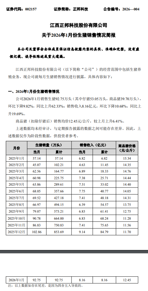2月9日,正邦科技(002157.SZ)发布2026年1月生猪销售简报。当月公司销售生猪92.75万头,其中仔猪53.05万头、商品猪39.70万头,实现销售收入8.16亿元。同比来看,生猪销售量增长62.33%,销售收入上升19.69%;环比则分别下降9.82%和10.68%。