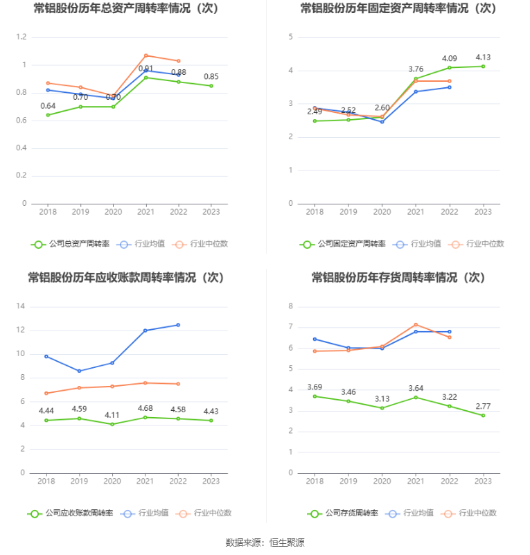数据统计显示,常铝股份近三年营业总收入复合增长率为16.24%,在铝行业已披露2023年数据的14家公司中排名第5。近三年净利润复合年增长率为-11.98%,排名11/14。