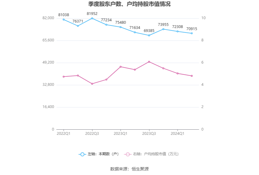 筹码集中度方面,截至2024年上半年末,公司股东总户数为7.09万户,较一季度末下降了1393户,降幅1.93%;户均持股市值由一季度末的5.04万元下降至4.82万元,降幅为4.37%。