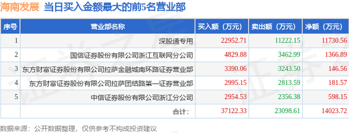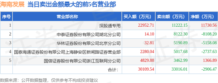 11月6日海南发展(002163)龙虎榜数据:北向资金净买入1.17亿元
