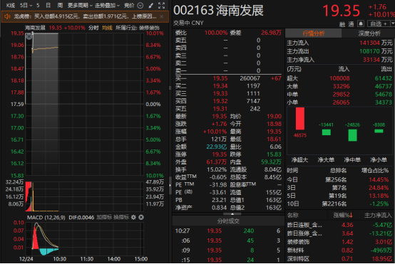 上证报中国证券网讯(记者 王玉晴)12月24日上午,海南发展开盘后快速封住涨停,股价达19.35元,实现4连板。