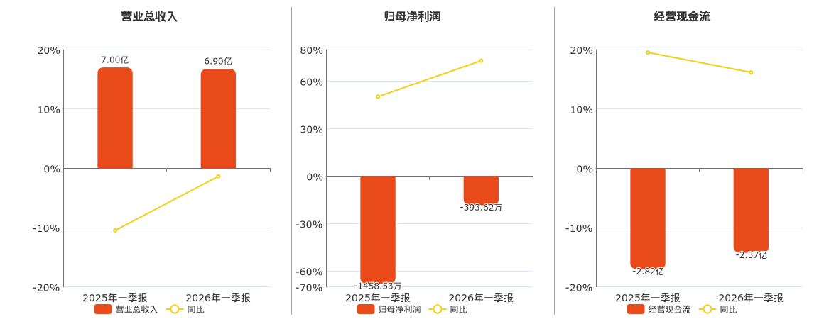 公司营业总收入为6.90亿元,在已披露的同业公司中排名第3。归母净利润为-393.62万元,在已披露的同业公司中排名第6,较去年同报告期归母净利润增加1064.91万元,实现4年连续上涨。经营活动现金净流入为-2.37亿元,较去年同报告期经营活动现金净流入增加4566.08万元,实现2年连续上涨。