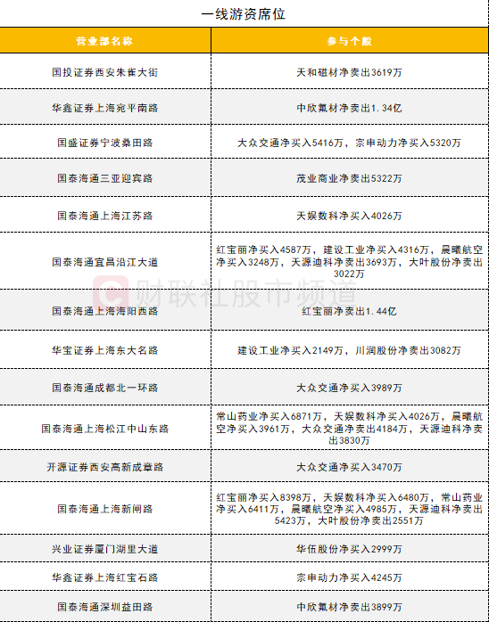 一线游资活跃度较高,智能网约车概念股大众交通获三家一线游资席位买入;化工股红宝丽获两家一线游资席位合计买入超1.2亿,同时遭国泰海通上海海阳西路营业部卖出1.44亿;PEEK材料概念股中欣氟材遭华鑫证券上海宛平南路营业部卖出1.34亿。