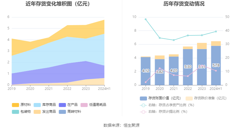 从存货变动来看,截至2024年上半年末,公司存货账面价值为5.78亿元,占净资产的39.44%,较上年末增加4627.01万元。其中,存货跌价准备为6836.61万元,计提比例为10.58%。