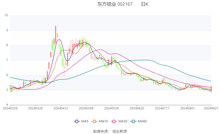 中证智能财讯 东方锆业(002167)8月22日披露2024年半年度报告。2024年上半年,公司实现营业收入8.14亿元,同比增长9.17%;归母净利润亏损5985.61万元,上年同期盈利2658.71万元;扣非净利润亏损6409.64万元,上年同期盈利2420.46万元;经营活动产生的现金流量净额为2.16亿元,上年同期为-1.81亿元;报告期内,东方锆业基本每股收益为-0.0792元,加权平均净资产收益率为-4.22%。