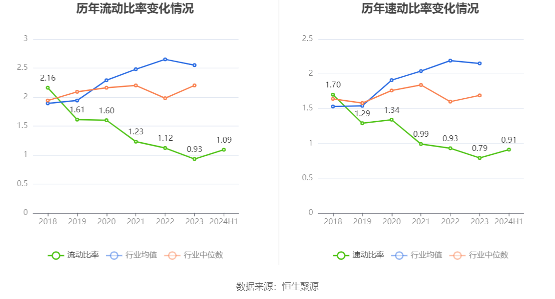 2024年上半年,公司流动比率为1.09,速动比率为0.91。