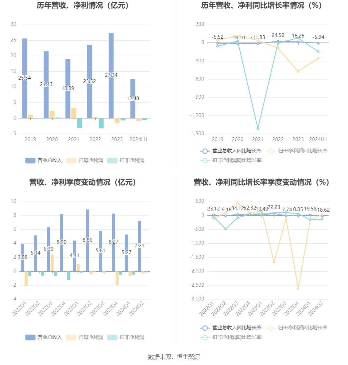 数据显示,2024年上半年公司加权平均净资产收益率为-2.99%,较上年同期下降4.76个百分点;公司2024年上半年投入资本回报率为-1.22%,较上年同期下降2.77个百分点。