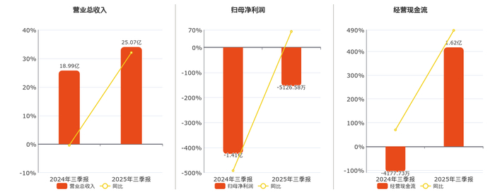 公司营业总收入为25.07亿元。归母净利润为-5126.58万元,在已披露的同业公司中排名第82。经营活动现金净流入为1.62亿元。