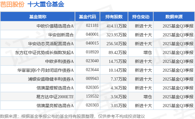 根据2025基金Q3季报公募基金重仓股数据,重仓该股的公募基金共12家,其中持有数量最多的公募基金为中欧基金的中欧价值精选混合A。中欧价值精选混合A目前规模为4.22亿元,最新净值1.4067(11月5日),较上一交易日上涨0.62%。该公募基金现任基金经理为张学明。张学明在任的基金产品包括:中欧景气精选混合A,管理时间为2024年4月23日至今,期间收益率为65.25%;中欧品质精选混合A,管理时间为2024年6月18日至今,期间收益率为21.29%;中欧红利精选混合发起A,管理时间为2024年7月26日至今,期间收益率为25.86%。