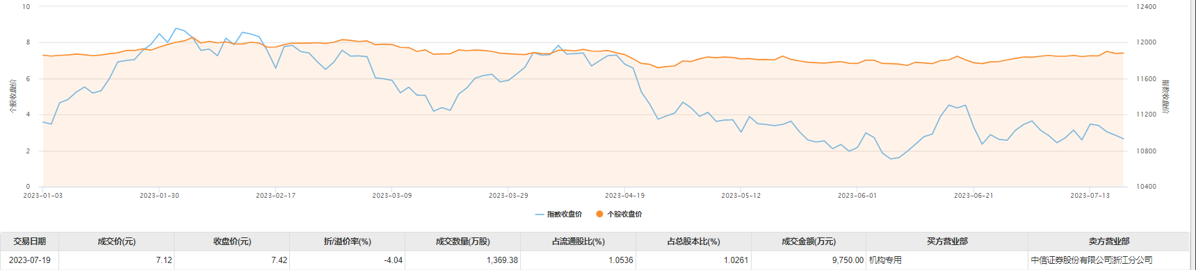 大宗交易成交1369.38万股,成交额9750万元,占当日总成交额的47.65%,成交价7.12元,较市场收盘价7.42元折价4.04%。