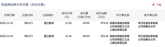 11月13日,楚江新材大宗交易成交88.64万股,成交额1011.38万元,占当日总成交额的1.09%,成交价11.41元,较市场收盘价12.38元折价7.84%。