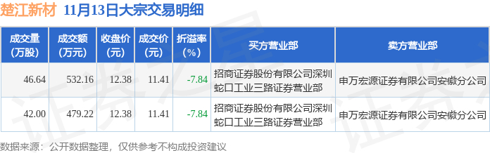 证券之星消息,11月13日楚江新材发生大宗交易,交易数据如下:
