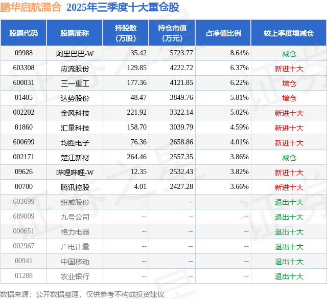 鹏华启航混合的前十大重仓股如下: