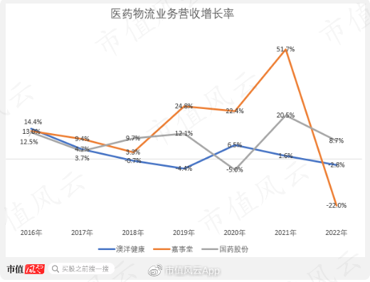 公司的医疗服务和医药物流业务2015-22年营收年均增长率仅分别为5.8%、2.5%。