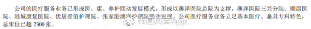 医疗服务方面,公司旗下主要有澳洋医院、澳洋医院三兴分院、顺康医院、港城康复医院、优居壹佰护理院、张家港澳洋护理院共6家医院及护理院,总床位超2,300张。