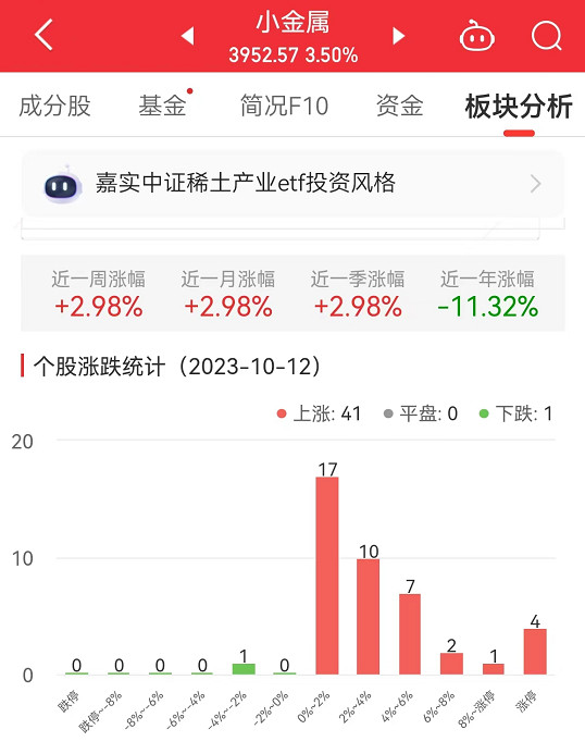 中国经济网北京10月12日讯 今日,小金属板块整体涨幅3.50%,其中,41只股票上涨,0只股票平盘,1只股票下跌。