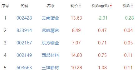 云南锗业、远航精密、东方锆业、西部材料、三祥新材位列涨幅榜后五位,涨幅分别为-2.01%、0.47%、0.71%、0.75%、1.08%。