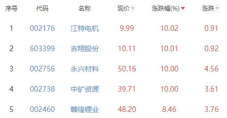 其中,江特电机、吉翔股份、永兴材料、中矿资源、赣锋锂业位列板块涨幅前五位,涨幅分别为10.02%、10.01%、10.00%、10.00%、8.46%。