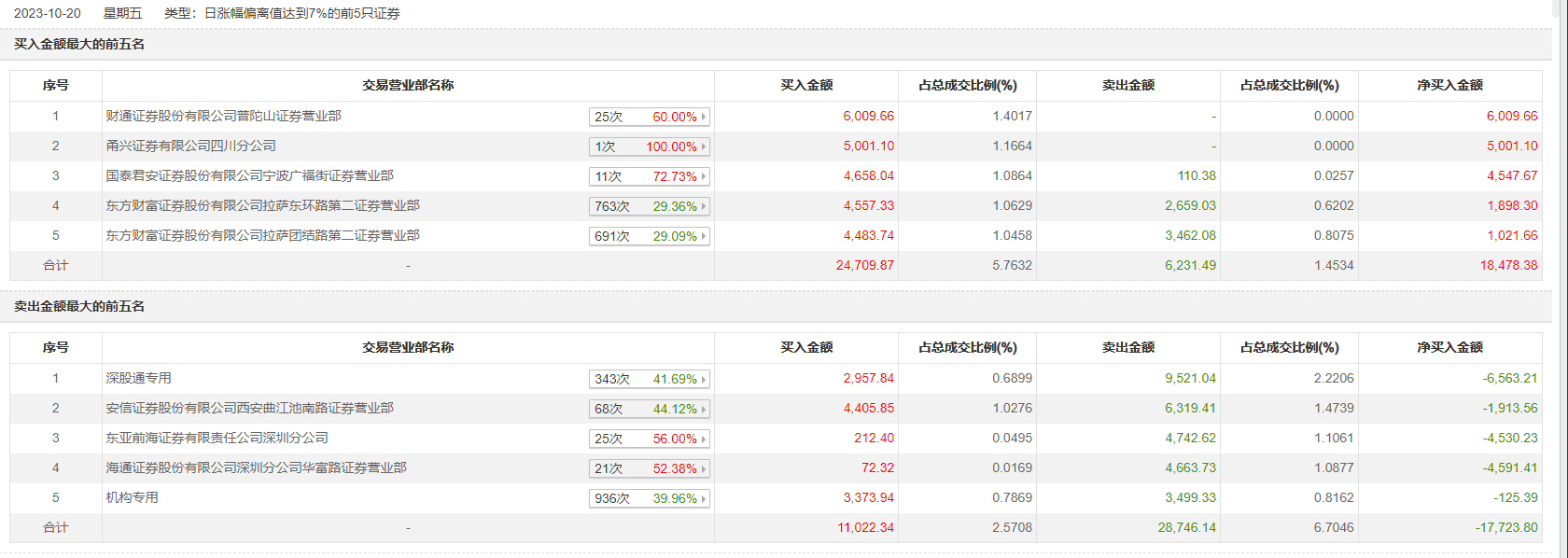 10月20日,江特电机(维权)今日涨停,全天换手率达20.16%,振幅达12.51%。龙虎榜数据显示,营业部席位合计净买入754.58万元。其中,机构买入3373.94万元,卖出3499.33万元,合计净卖出125.39万元。此外,财通证券普陀山证券营业部、甬兴证券有限公司四川分公司分别买入6009.66万元、5001.10万元;深股通专用、安信证券西安曲江池南路证券营业部分别卖出9521.04万元、6319.41万元。