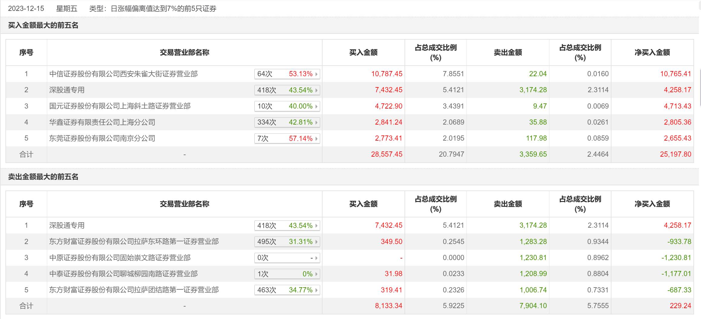具体来看,知名游资现身龙虎榜,方新侠(中信证券西安朱雀大街证券营业部)、深股通专用分别买入1.08亿元、7432.45万元;深股通专用、东方财富证券拉萨东环路第一证券营业部分别卖出3174.28万元、1283.28万元。