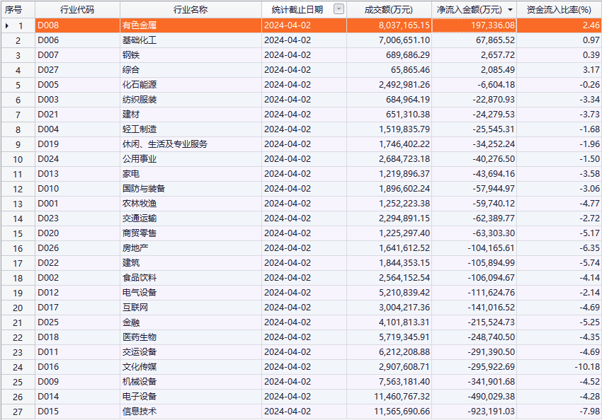 上证报中国证券网讯 据Choice数据统计,今日A股主力资金净流出354.57亿元;行业方面,有色金属净流入居首,为19.73亿元,基础化工净流入6.79亿元,钢铁净流入0.27亿元;净流出金额最多的是信息技术,为92.32亿元,电子设备净流出49亿元,机械设备净流出34.19亿元。个股方面,主力资金净流入前三的是江特电机、中润资源、长安汽车,分别净流入3.76亿元、2.51亿元、2.35亿元;净流出前三的是浪潮信息、万丰奥威、万科A,分别净流出12.18亿元、6.49亿元、5.96亿元。